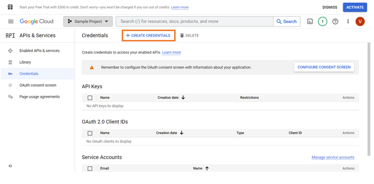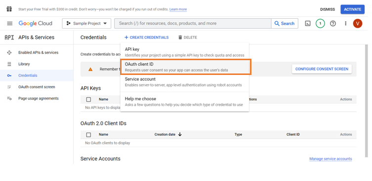 Click Create Credentials to select the type of credentials to access the application.