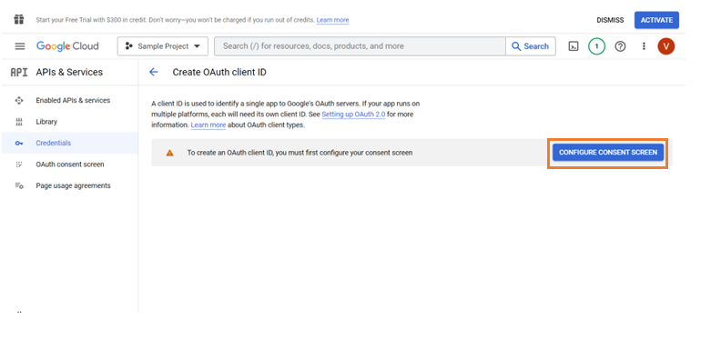 Click Configure Consent screen to get directed to OAuth consent screen where we add user type, scope and developer details.