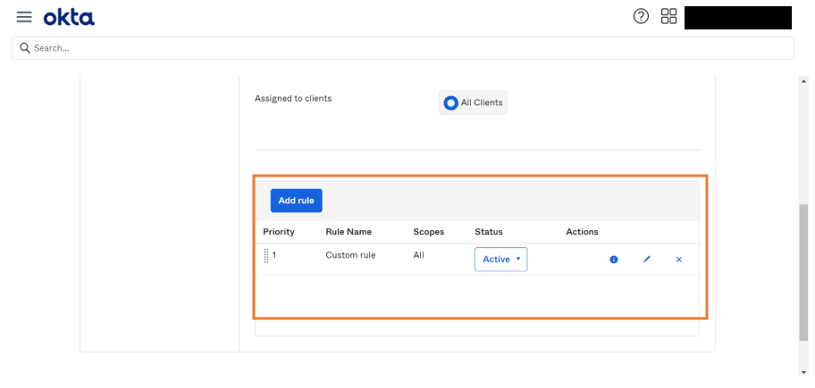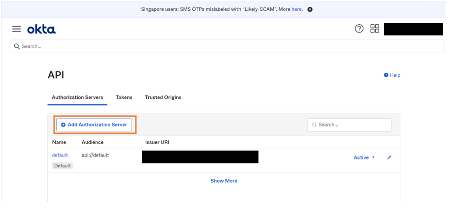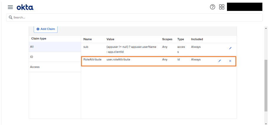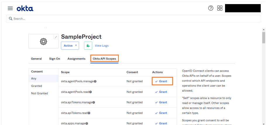 - Go to Okta API Scopes and click Grant to include it as scope.