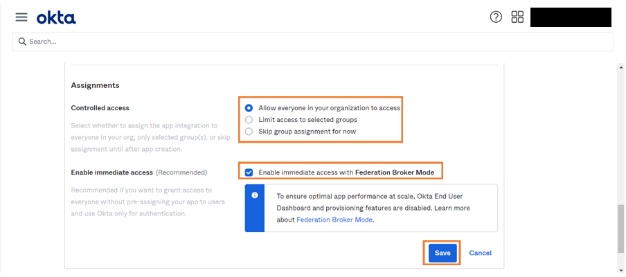 - Select the appropriate access restriction and click Save. This steps ensures domain restrictions to access the application.