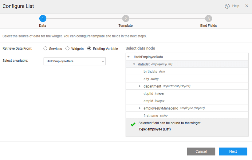 • The template selected in the previous step provides a set of widgets that need to be bound to the corresponding field from the data source selected in the first step.