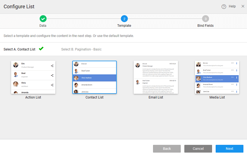 In this step, you are expected to select a template and pagination style suitable for the current use case. For this example, we are choosing Contact List as the template and Basic as pagination style.