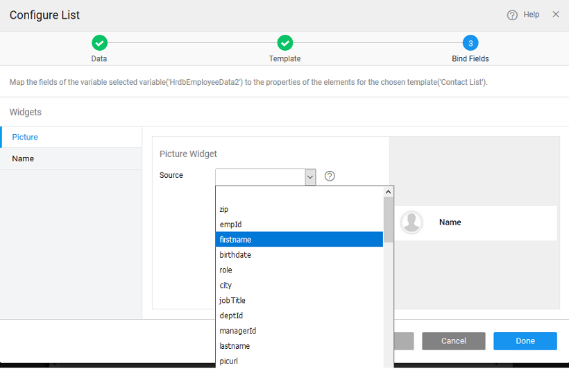 • The template selected in the previous step provides a set of widgets that need to be bound to the corresponding field from the data source selected in the first step.