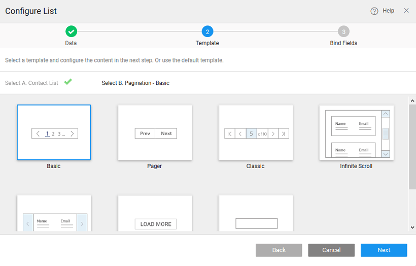 In this step, you are expected to select a template and pagination style suitable for the current use case. For this example, we are choosing Contact List as the template and Basic as pagination style.