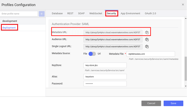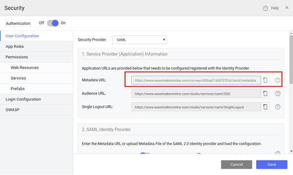 4. Preview the app and open the Security dialog again. Note the Metadata URL from the WaveMaker App:
