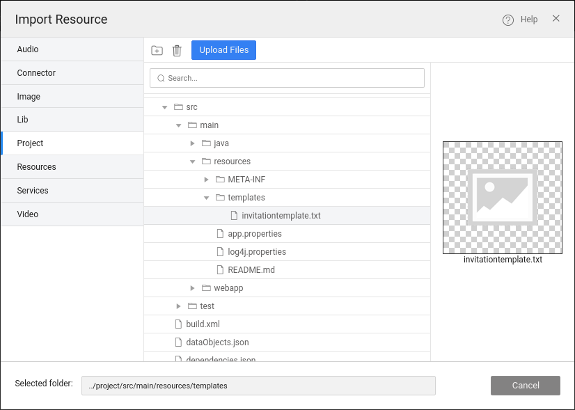 • Import the downloaded email-connector zip into your app using the Import Resource option to the Connector folder.
