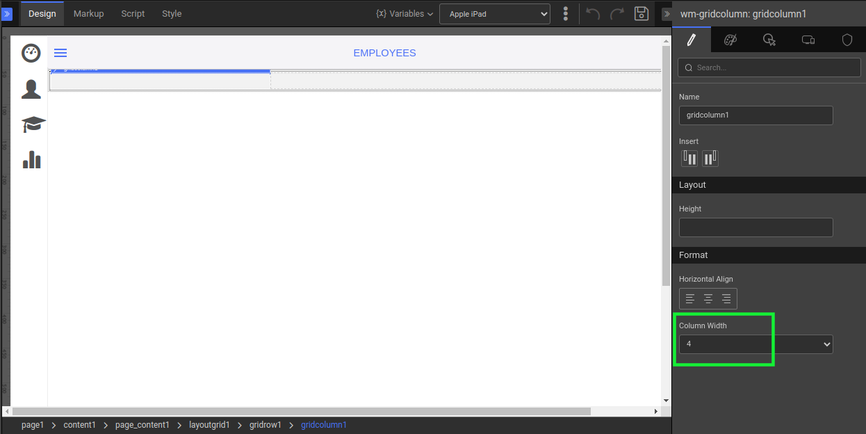 3. The first column contains the List widget, which is bound to Employees.