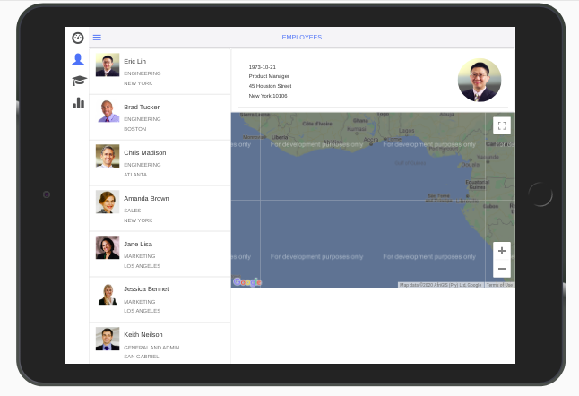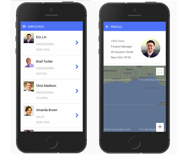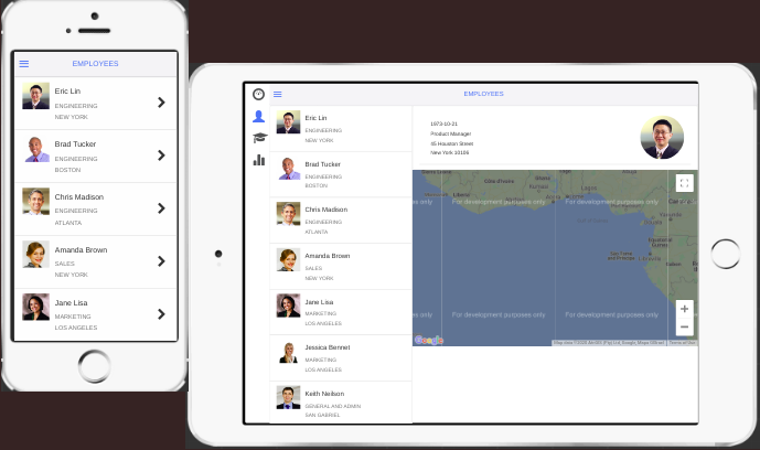 With the help of the properties above, develop an app with the list of employees and their detailed-profile. The view is different for the tablet and mobile as shown below.