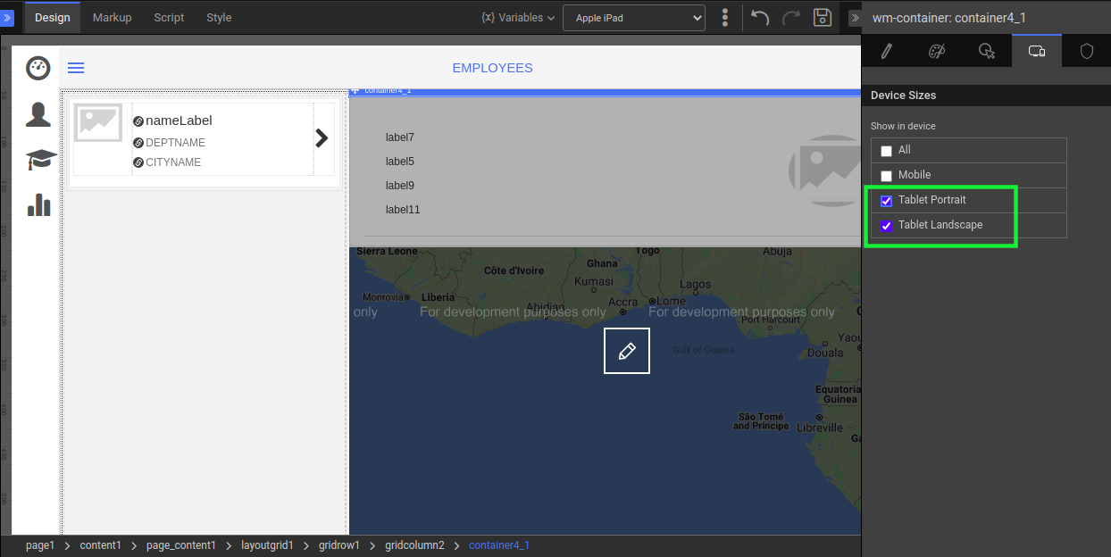 7. But this second column should be displayed only in tablet view. Therefore, configure this by setting the showindevice property to Tablet Portrait and Tablet Landscape.