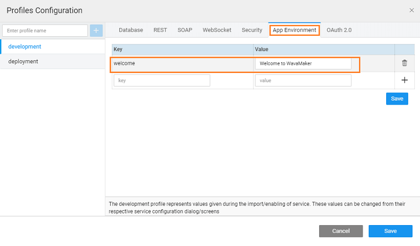 This property, when deployed with development profile, will have the value “Welcome to WaveMaker” while when deployed with deployment profile will have the value “Welcome to Cloud”