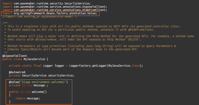 3. You can use the app environment variable welcome in Java service by annotating the variable with @Value(“${app.environment.welcome}”).Include the following import statement to the Java Service: