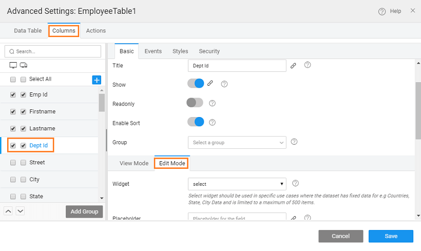• The Columns tab from the Advanced Setting dialog lists all the fields from the referenced entity.