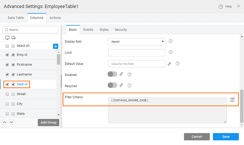 • Filter Criteria option is available only for the primary key field, under Edit Mode.