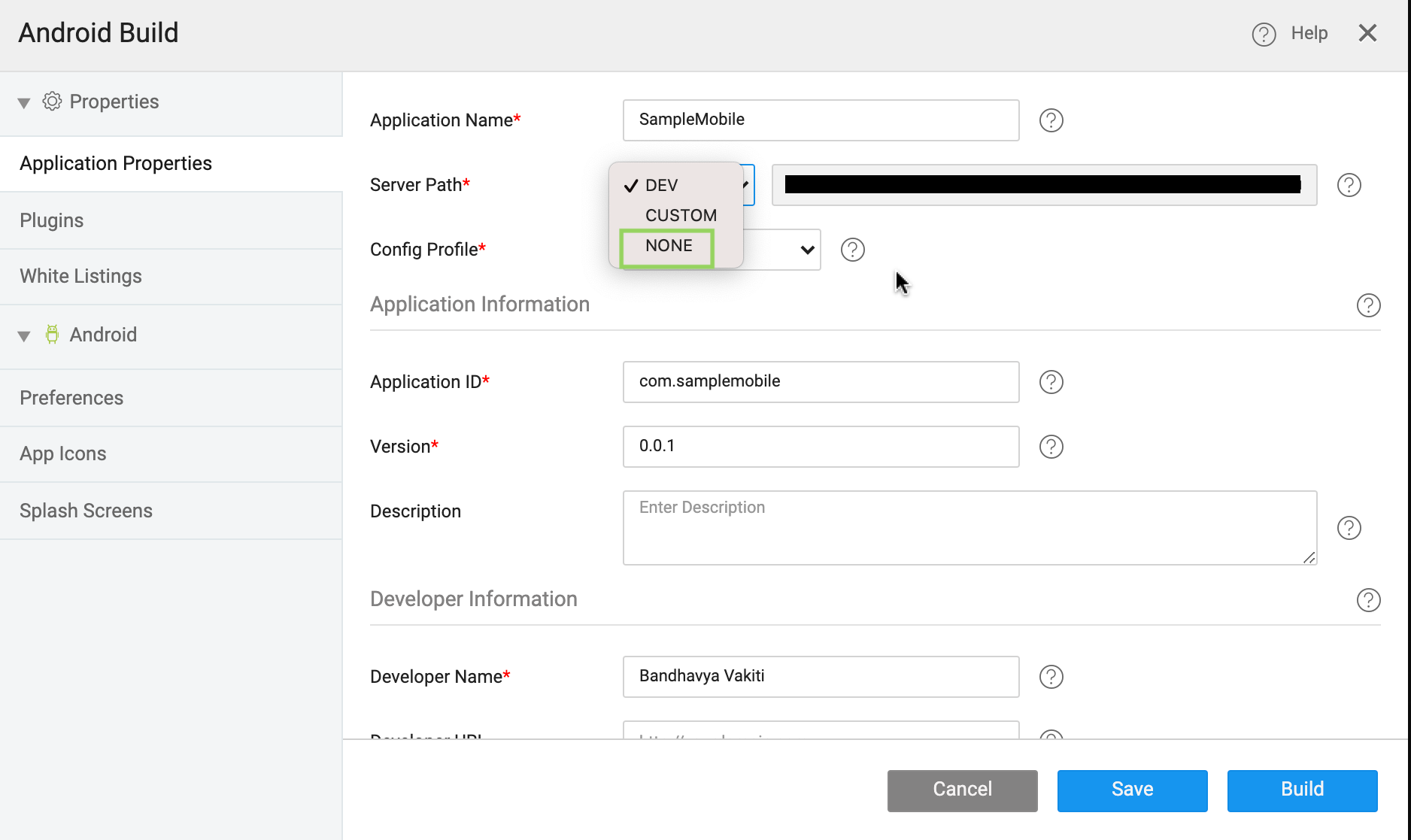 For building a .apk file, Mobile Configuration needs to be set. Mobile Configuration can be set separately for each pre-defined app configurations – DEV or PROD.