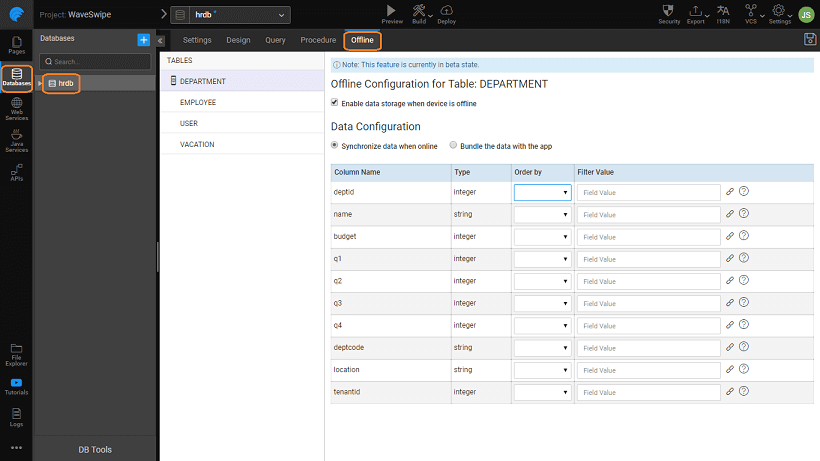 If a table has to be available in offline, select the table and then check the flag ‘Enable data storage when device is offline'.