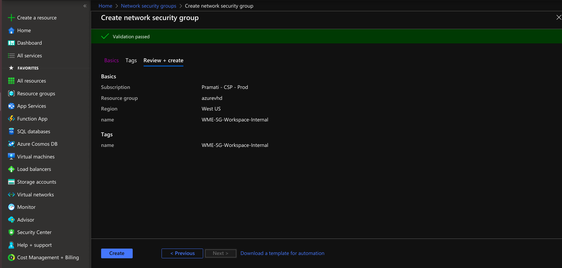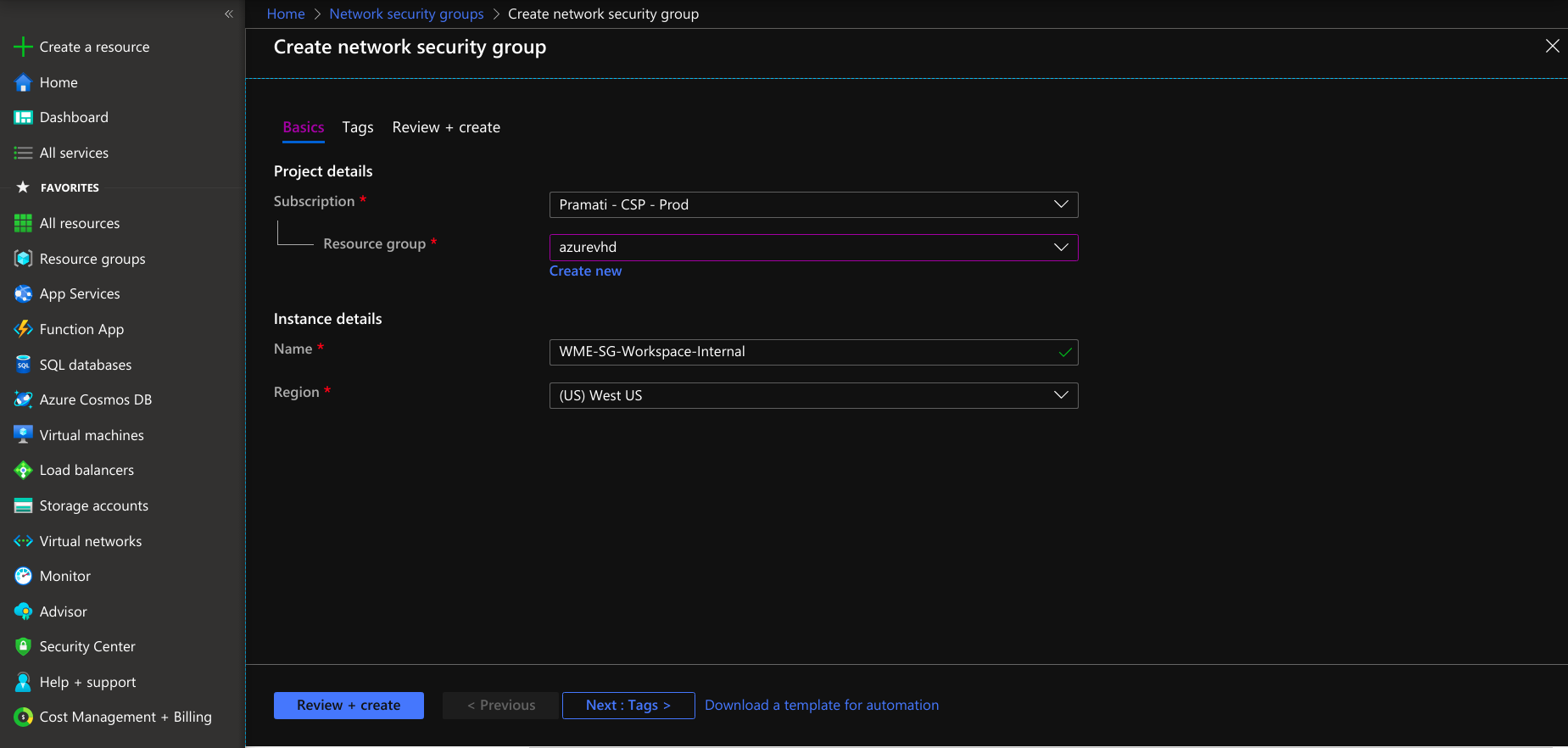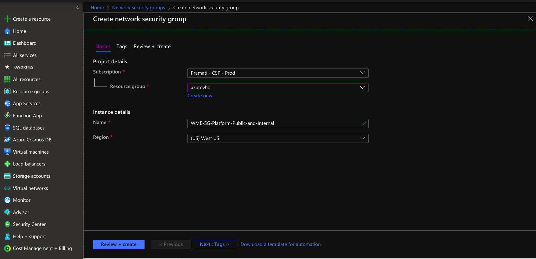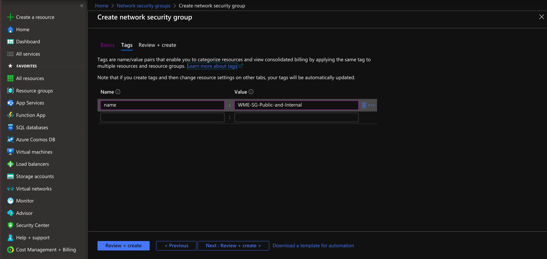 - Provide tags that are name-value pairs for the network security group for categorizing the resources.