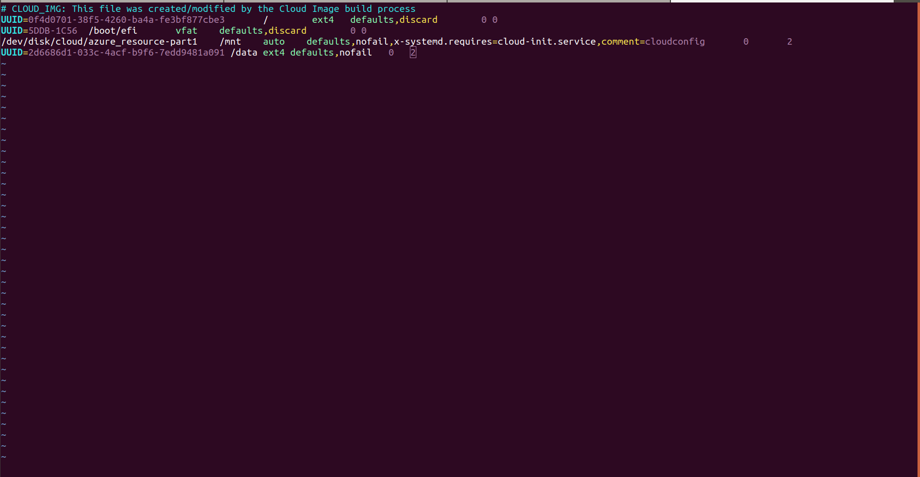 - Entry the UUID of the disks in fstab.use the following format.