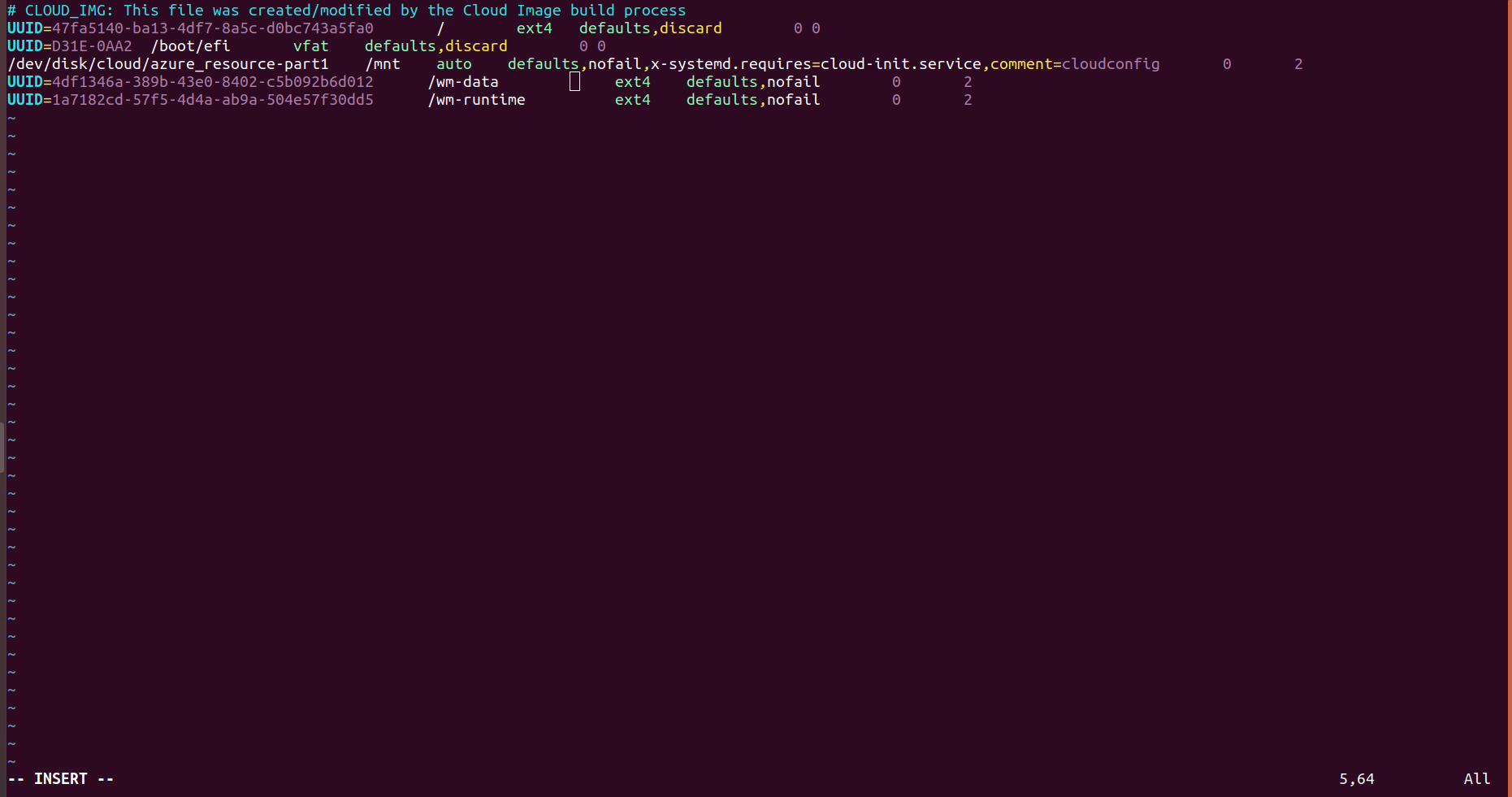 UUID=<block-device_1-UUID> /wm-runtime ext4 defaults ,nofail 0 2