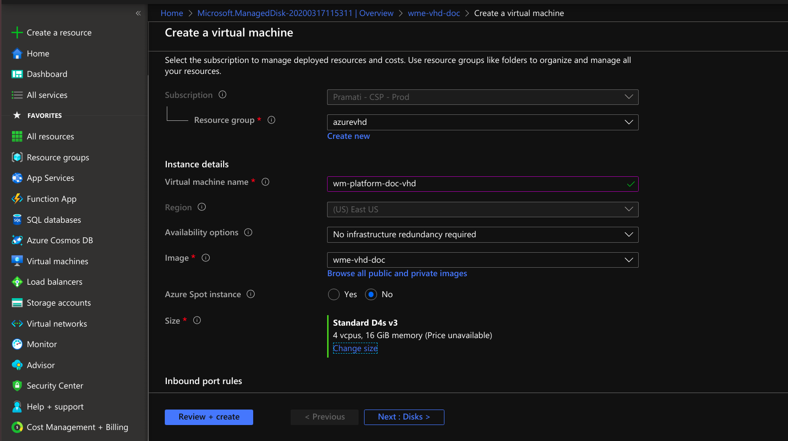 - Select create VM option at the left top. create VM providing required details disks and networking.