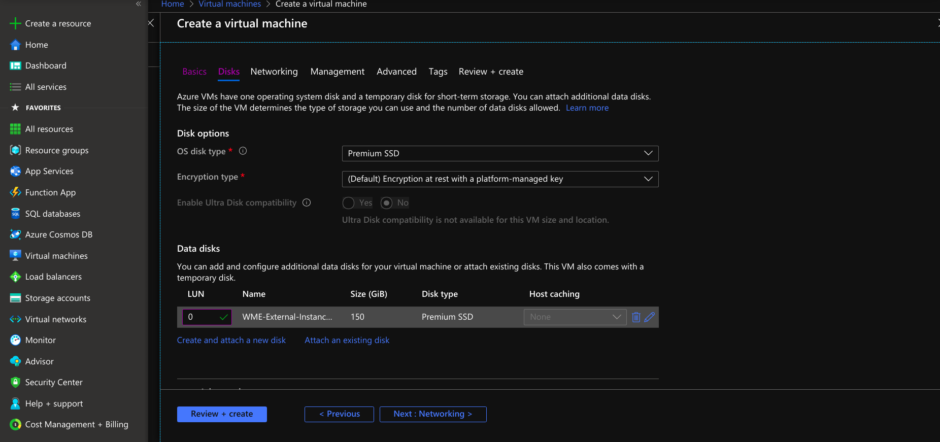 • Create a disk for external usage at the disk section and provide a minimum of 100GB size with premium SSD disk type.