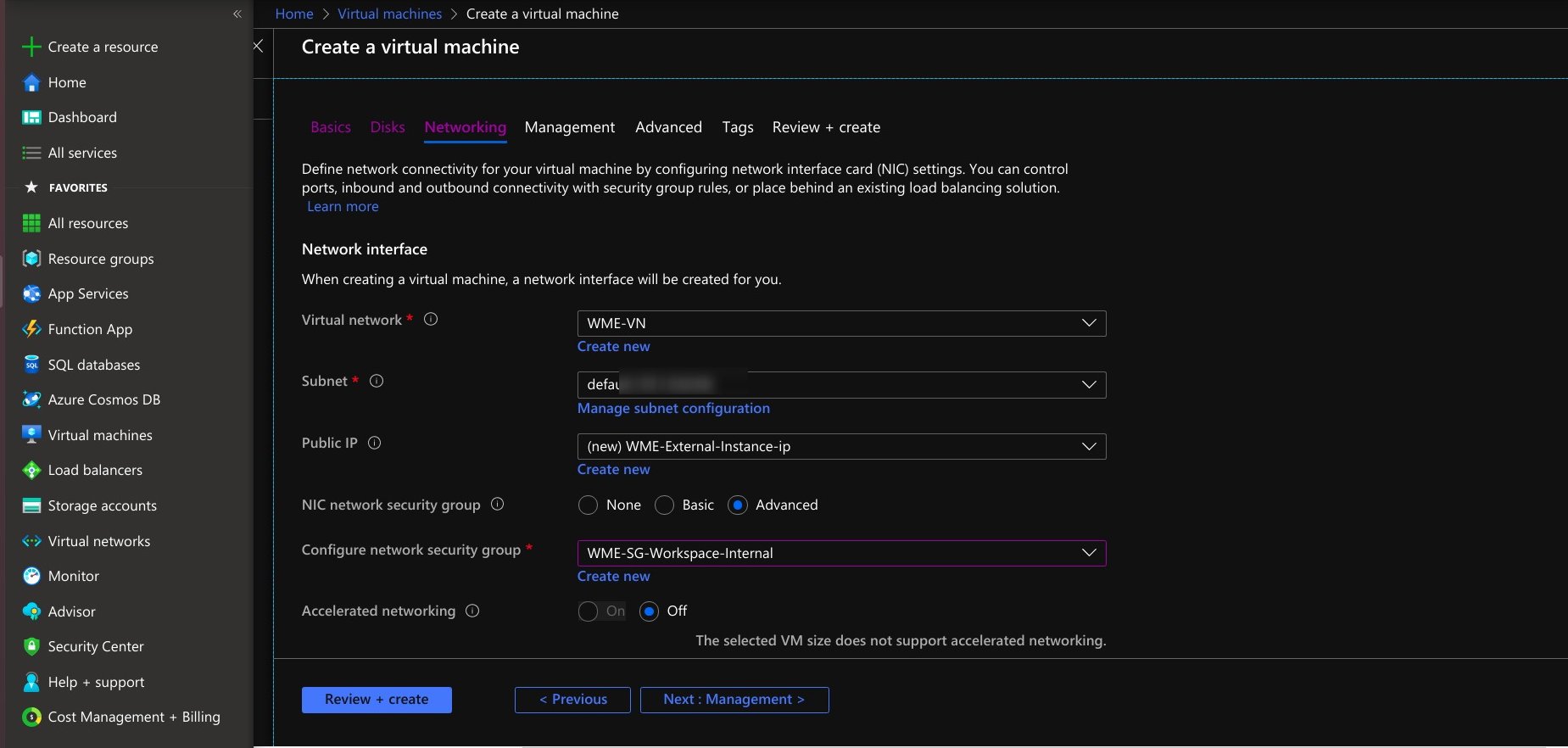 • At the networking section, provide the created-virtual network details for the virtual network. At the NIC network security group, select advanced options to give the network security group of Studio Workspace Virtual Machine/App Deployment Virtual Machine.
