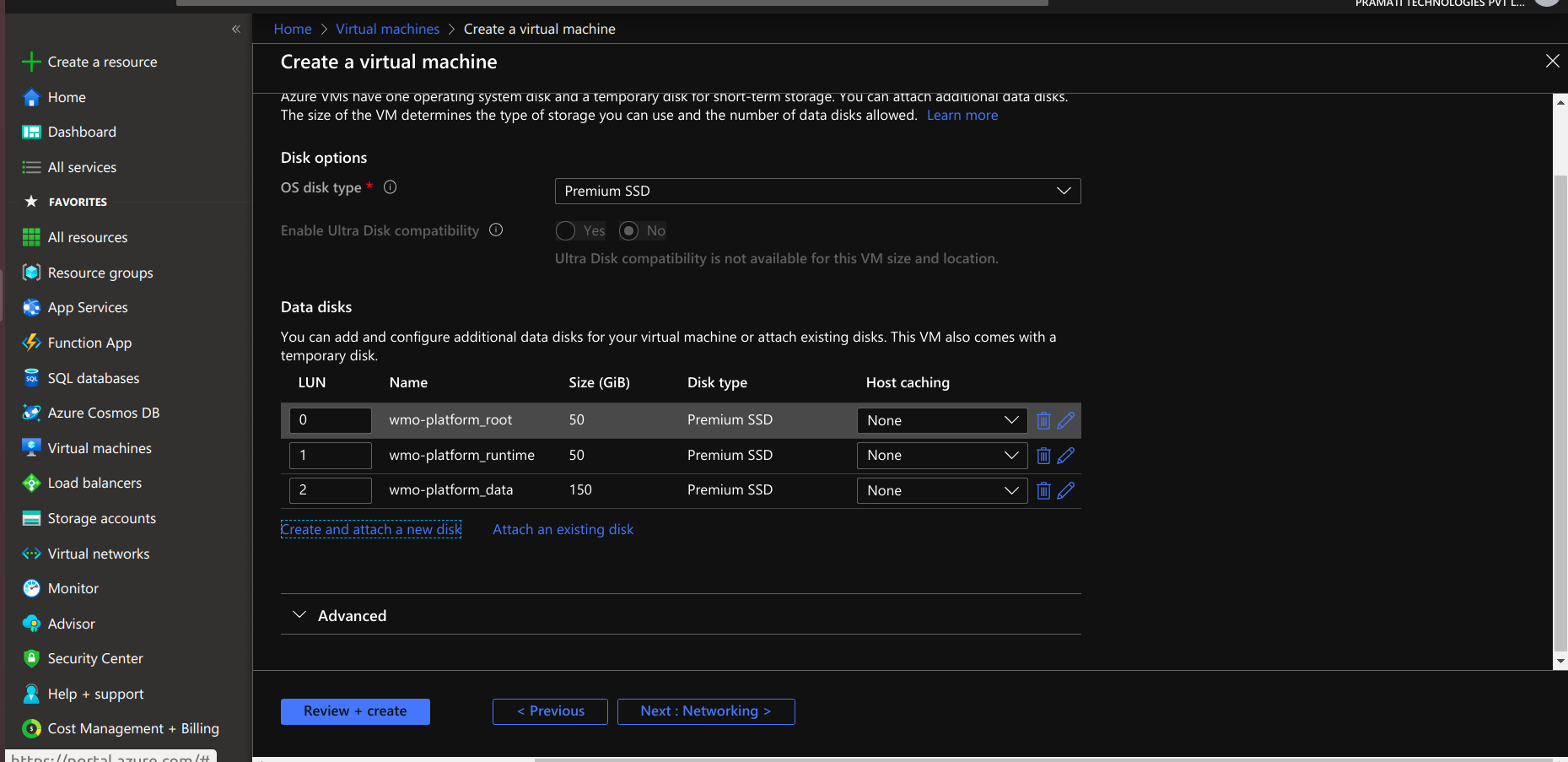 • At disk section create 2 disks one for wm-runtime and another for wm-data with 50 and 150 GB size.if you want any additional disk you can add.