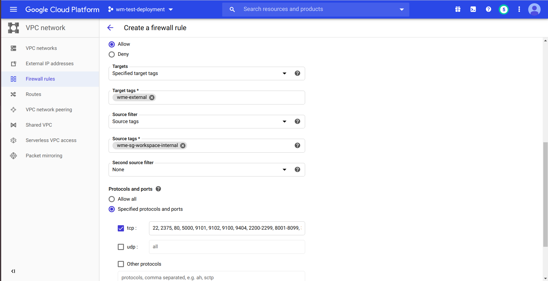 • Select target type and source filter type. by using the target we can connect the firewall rule to Instance. example the which Instance have target tag the firewall is connect to that Instance and by using the source we can open ports to specific Instance. example the which Instance have a source tag the ports will be open to that Instance.we provide this tags at network section during the Instance creation.or else you can select your own Target and Source methods.