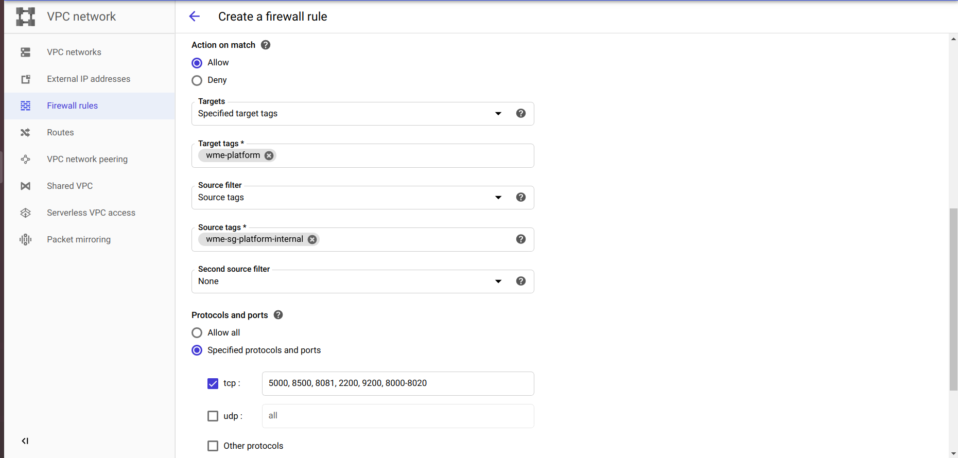 • Select target type and source filter type.by using the target we can connect the firewall rule to Instance. example the which Instance have target tag the firewall is connect to that Instance and by using the source we can open ports to specific Instance. example the which Instance have a source tag the ports will be open to that Instance. we provide this tags at network section during the Instance creation.or else you can select your own Target and Source methods.
