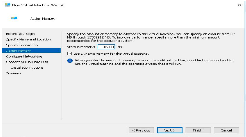 - Enter the memory as 16000 MB. You can use the dynamic memory option as per the requirements and click next.