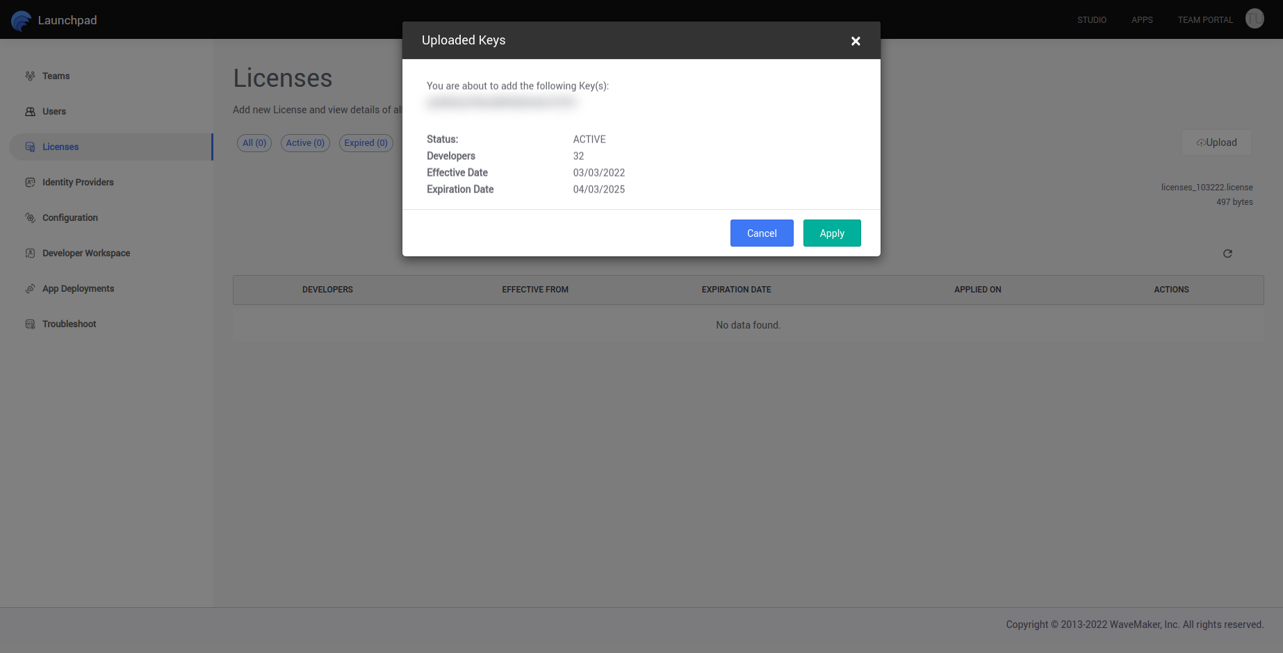 At license section, select the Upload to upload license key file shared by WaveMaker team.